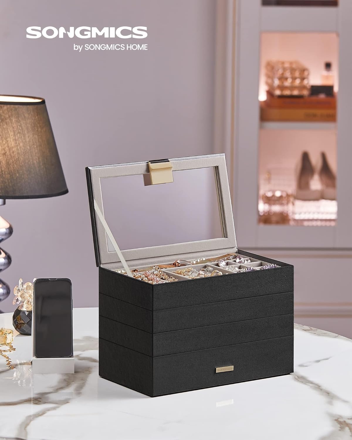 SONGMICS Stackable Jewelry Trays, 4-Tier Jewelry Box, Drawer Jewelry Organizer, with Glass Lid, Removable Dividers, for Vanity Table, 6.7 x 11 x 7.2 Inches, Gift Idea, Ink Black UJBC164B01