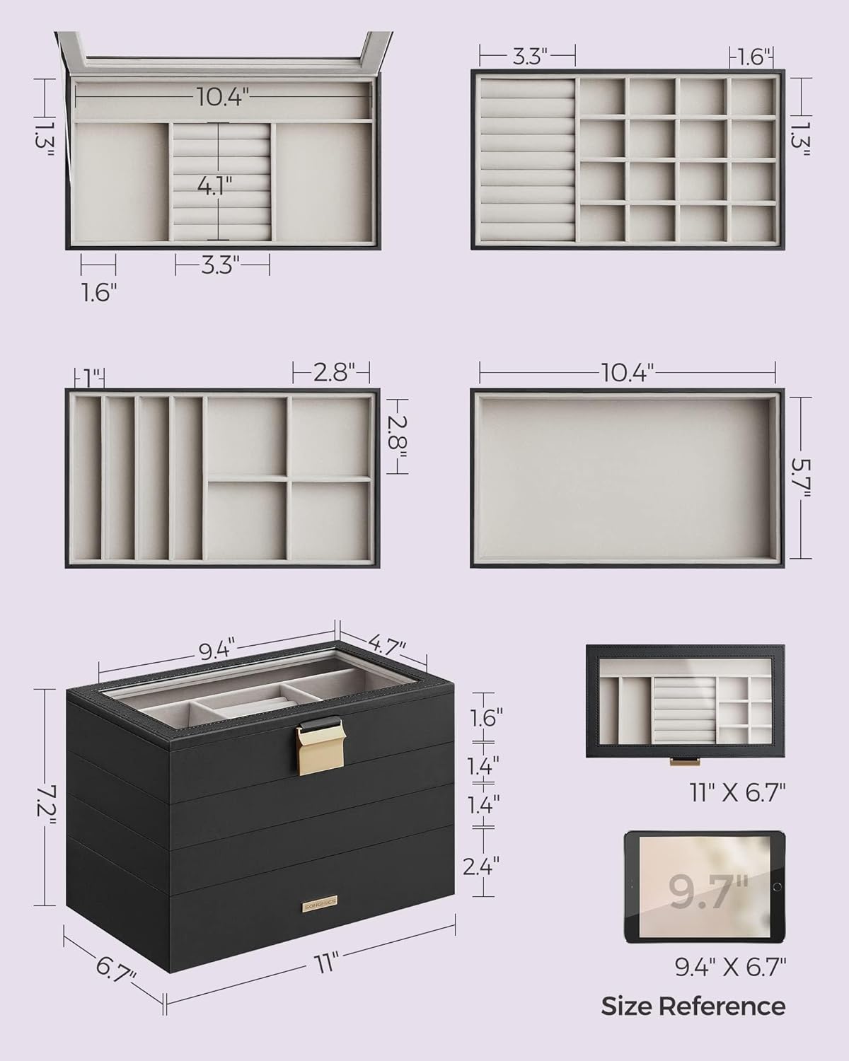 The removable dividers make it easy to customize the layout to fit your unique jewelry collection, while the stackable design saves space on your vanity table. With dimensions of 6.7 x 11 x 7.2 inches, this jewelry organizer is compact yet spacious enough to hold all of your earrings, rings, bracelets, and more.