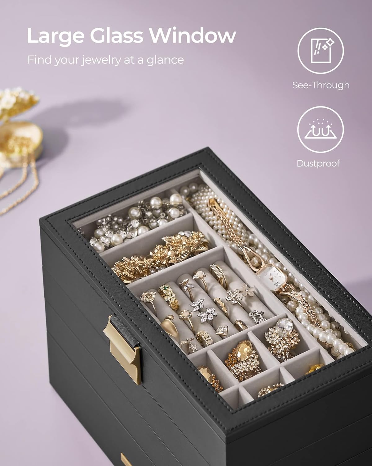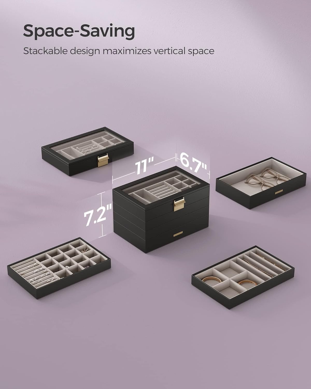Introducing the SONGMICS Stackable Jewelry Trays, the perfect solution for organizing and displaying your precious jewelry collection. This 4-tier jewelry box features a sleek ink black design with a glass lid, allowing you to easily see and access your favorite pieces.